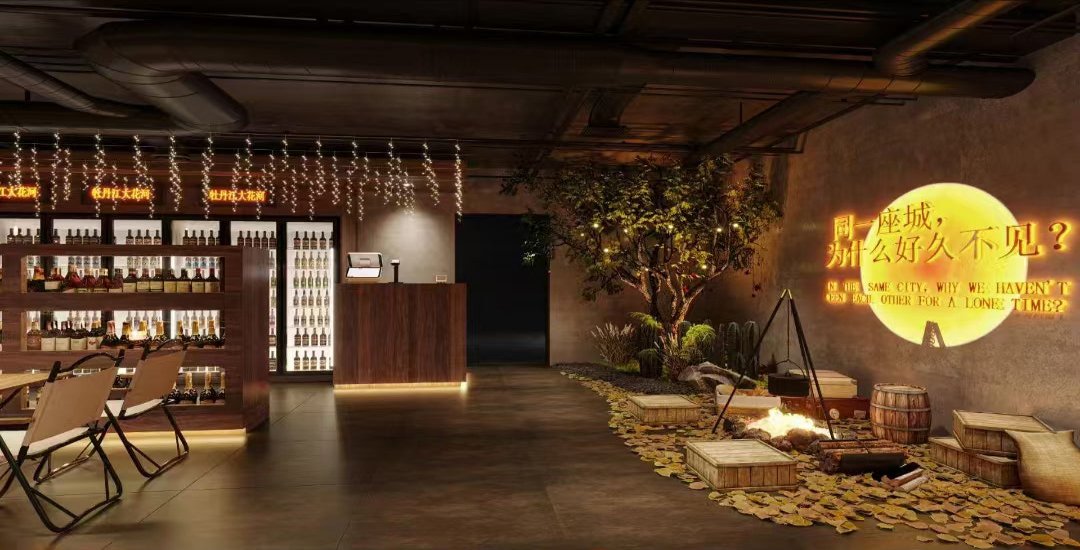 酒吧内部装饰有特色,左侧是一个酒架,上面摆满了各种酒瓶,酒架上方有霓虹灯装饰。中间有一个柜台,柜台上方有一些灯饰。右侧墙壁上有一个大型的圆形霓虹灯标语,写着 “同一座城,为什么好久不见?”,营造出一种怀旧和思念的氛围。地面上有一些木质的箱子和桶,还有一个模拟的篝火场景,周围散落着树叶,给人一种户外露营的感觉。整体氛围温馨且富有创意。