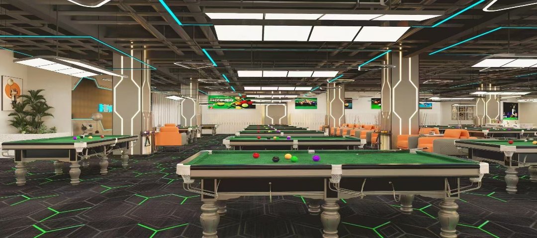 整体设计充满科技感,天花板上装有蓝色和白色的灯光,营造出一种时尚且充满活力的氛围。室内摆放着多张台球桌,每张台球桌都覆盖着绿色的台布,球桌上摆放着彩色的台球。台球桌周围有橙色的座椅,供玩家休息使用。墙壁上挂有几幅装饰画,增加了空间的艺术感。地面铺有黑色带有绿色线条图案的地毯,与整体环境相协调。整个台球室布局合理,设施齐全,适合台球爱好者前来娱乐。
