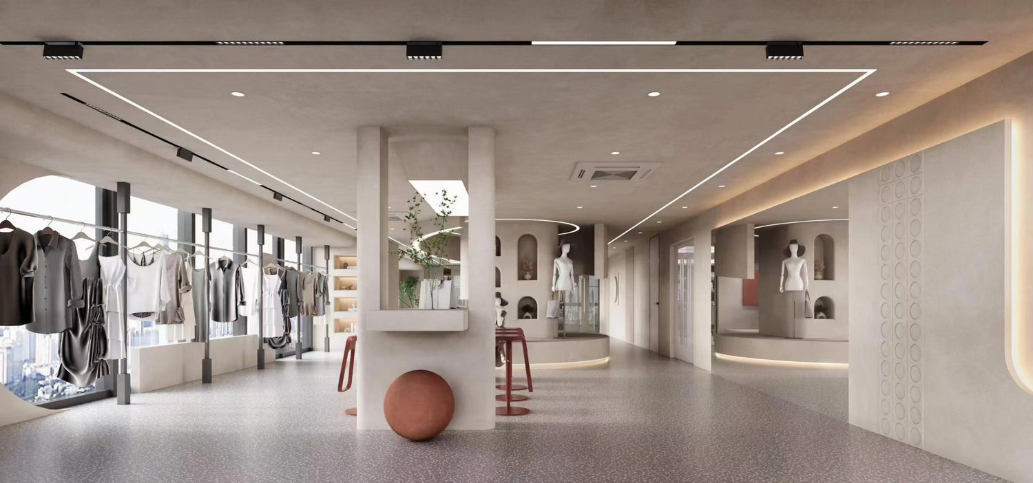 整体色调以浅色为主,营造出简洁、明亮的氛围。店铺的天花板上安装了黑色的轨道灯,提供充足的照明。左侧墙壁上有一排弧形的展示架,上面挂着各种款式的服装,方便顾客浏览。中央区域有一个圆形的展示台,上面摆放着一些装饰品。右侧墙壁上有一些拱形的装饰设计,增加了空间的层次感。店铺的尽头有几个人体模特,展示着店内的服装。地面采用灰色的地砖,与整体风格相协调。
