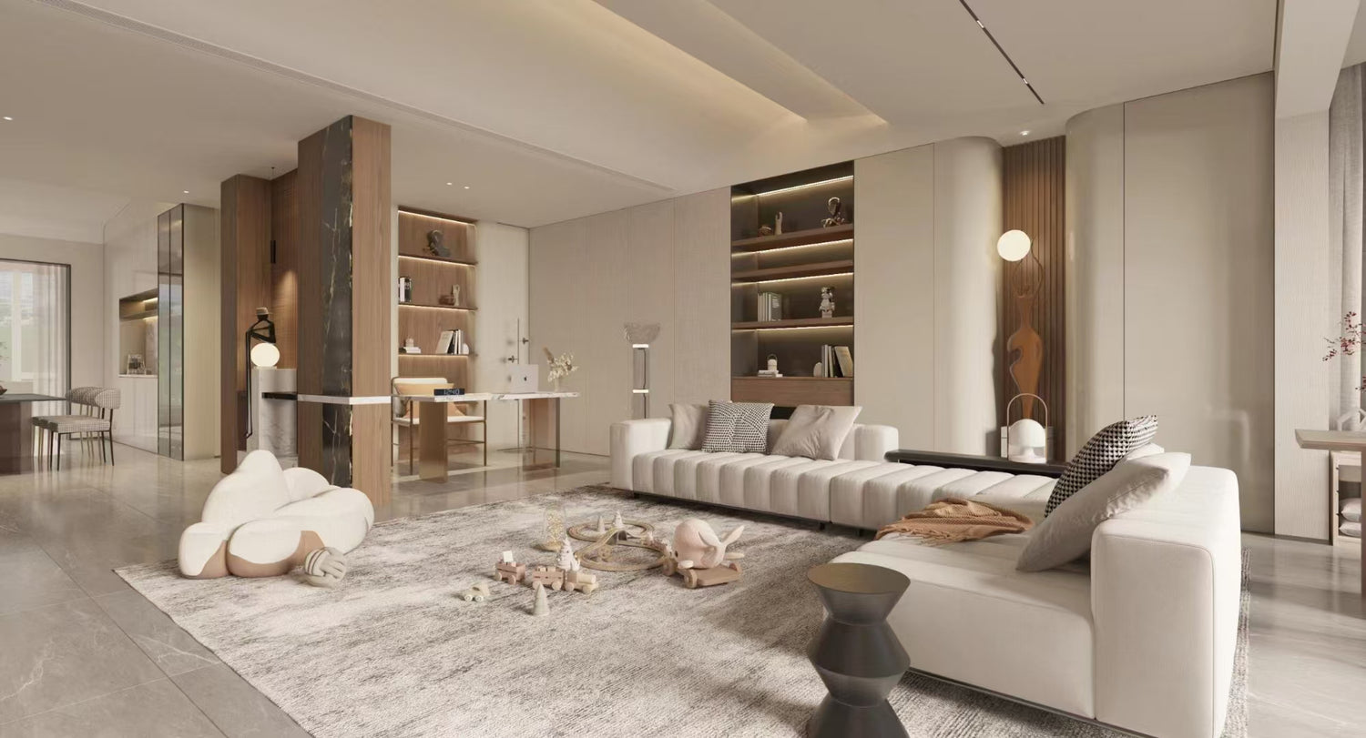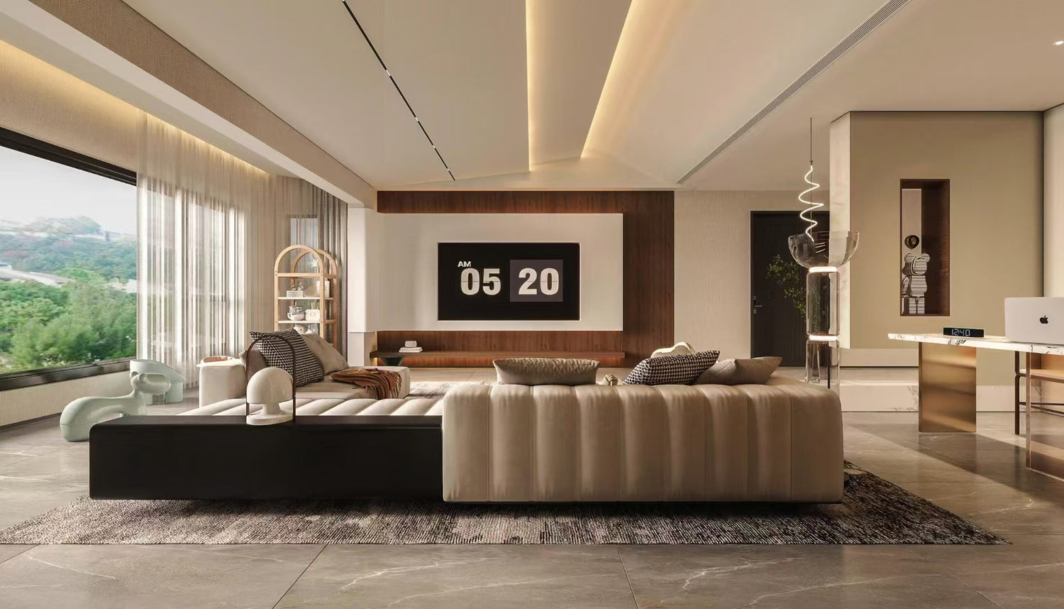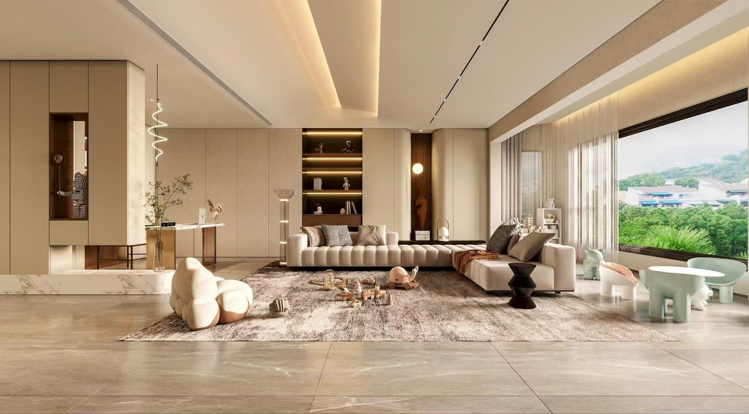 整体色调柔和,以米色、浅木色为主,营造出温馨氛围。浅米色沙发搭配多色靠垫,时尚舒适。黑色长几与沙发形成对比。背景墙设有数字时钟,增添现代感。左侧大窗户引入充足自然光线,窗外景色宜人。客厅摆放独特的艺术装饰品,如螺旋形吊灯和雕塑。地面铺有光滑瓷砖,搭配大面积地毯,和谐美观,空间显得明亮且富有现代感。