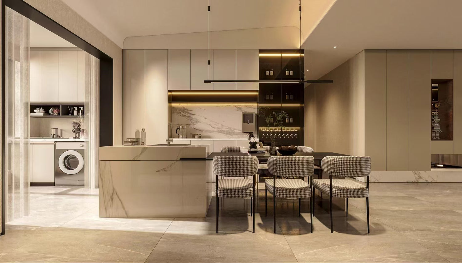 整体色调柔和,以浅色为主。厨房的操作台面为大理石材质,美观且耐用。橱柜设计简约,带有嵌入式照明,增加了空间的现代感。餐厅配有六把格子纹的餐椅和一张长方形餐桌,餐桌上方悬挂着独特的吊灯。背景墙设计简洁,地面采用光滑的瓷砖,整个空间显得明亮、整洁且富有设计感。